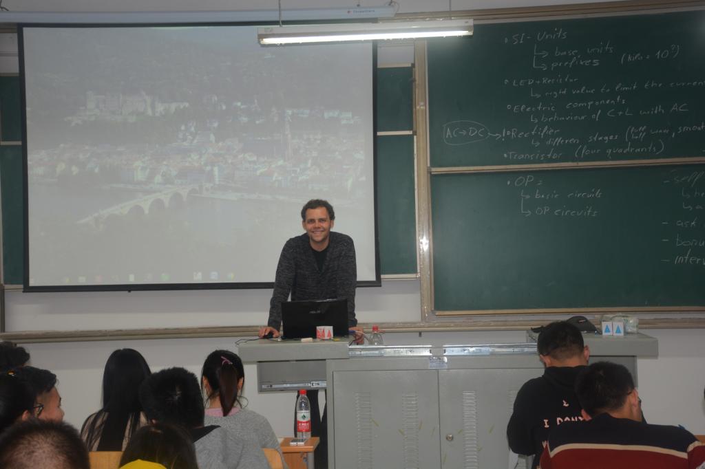 自10月8日至10月26日,在这金秋时节里,中德学院2015级电气工程及其自动化(中外合作办学)的同学们迎来了本学期教授测量技术、驱动学的外教—Carlo Vondano。Carlo来自海德堡应用技术大学,之前已数次来我校教授课业,对于电气工程及其自动化的120位同学们来说,他已是一位老朋友了。