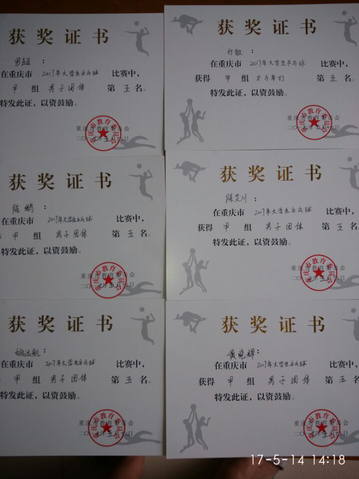 我校乒乓球队在2017年重庆市大学生乒乓球比赛中顽强拼搏,荣获甲组男子团体第五名。付敏同学荣获甲组女子单打第五名。