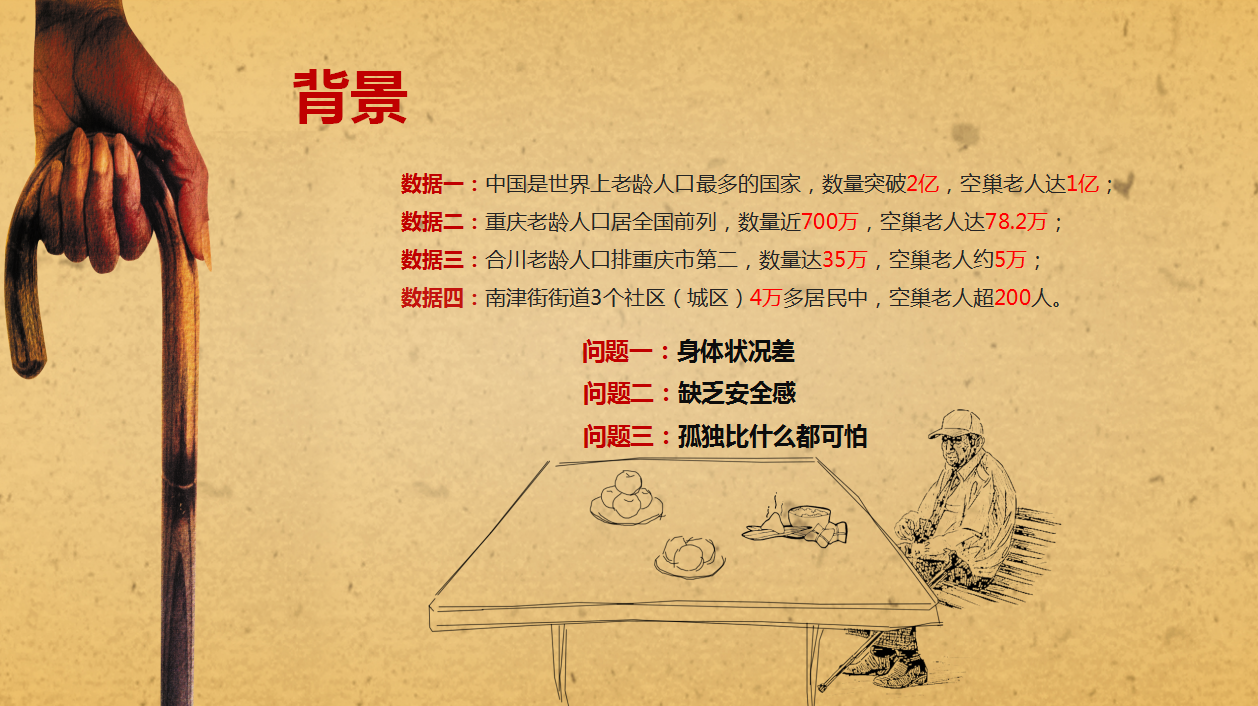 目前中国正在步入老龄化社会,已成为世界上老龄人口最多的国家,其中空巢老人超过一亿,重庆市空巢老人占比虽小,但却居全国前列。合川区的老龄化在重庆市更为严重。空巢老人的照顾服务需求不断增加,传统的救助方式及理念已不能适应快速出现的多元化需求。由此,“幸福来敲门——关爱社区空巢老人行动”应运而生。