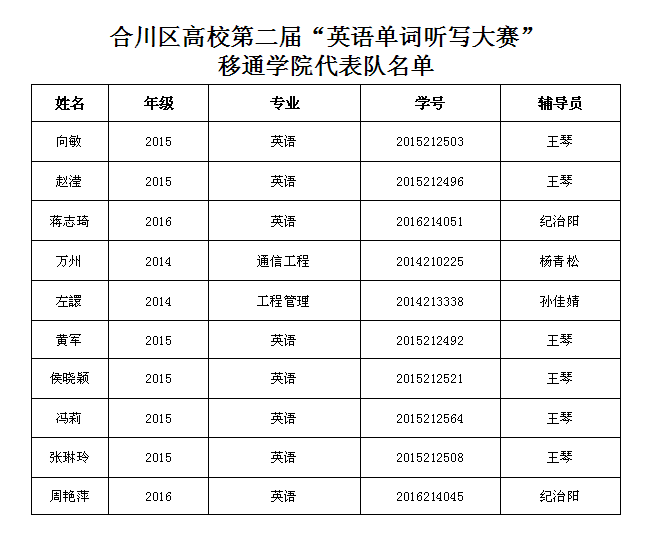 “词王”争霸赛采用了抢答的形式,更加考验了选手的心理素质及反应能力。最终,“彩虹队”获得第团体赛冠军,外语系2015级英语专业黄军同学夺得“词王”的称号。同时,通过此次比赛,也选拔出了十位实力战将,他们将代表移通学院迎战两年一届的合川区高校英文单词听写大赛的决赛。