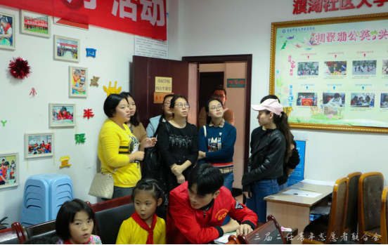 由外国语言文学系青年志愿者协会负责对接的“濮湖社区”市民学校为此次走访的最后一站。走到“教室”门口辅导员都很惊讶,因为这个教室很安静,老师们也不由得放轻脚步,害怕影响课堂秩序。该市民学校的负责老师纪治阳老师详细的讲解其开展情况。