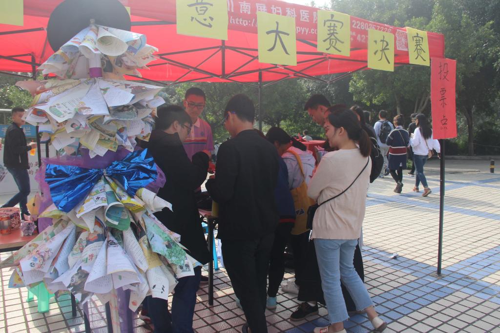 初赛的热情还没有褪去,11月2日在天梯下展开了决赛的大众投票环节。我们将每一件参赛作品编号并进行公开展示,参赛者们互相学习、共同进步,而同学们也在课间的时候为自己喜欢的作品投上宝贵的一票,与此同时工作人员也为大家讲解作品的创作理念并传播环保的重要性,呼吁大家多多参与环保创新活动,构建一个美好生态家园。