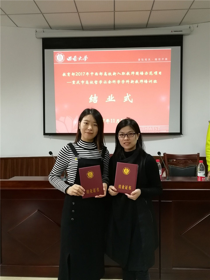 为建立健全高校新入职教师培训制度,加强高校教师队伍建设,提高高等教育质量,重庆市教委于2017年10月份组织100名重庆市本科高校新入职教师在西南大学集体参加为期20天的全脱产国家级示范培训,我校思政部新入职教师靳银霞、孔坤杰参加了此次培训。