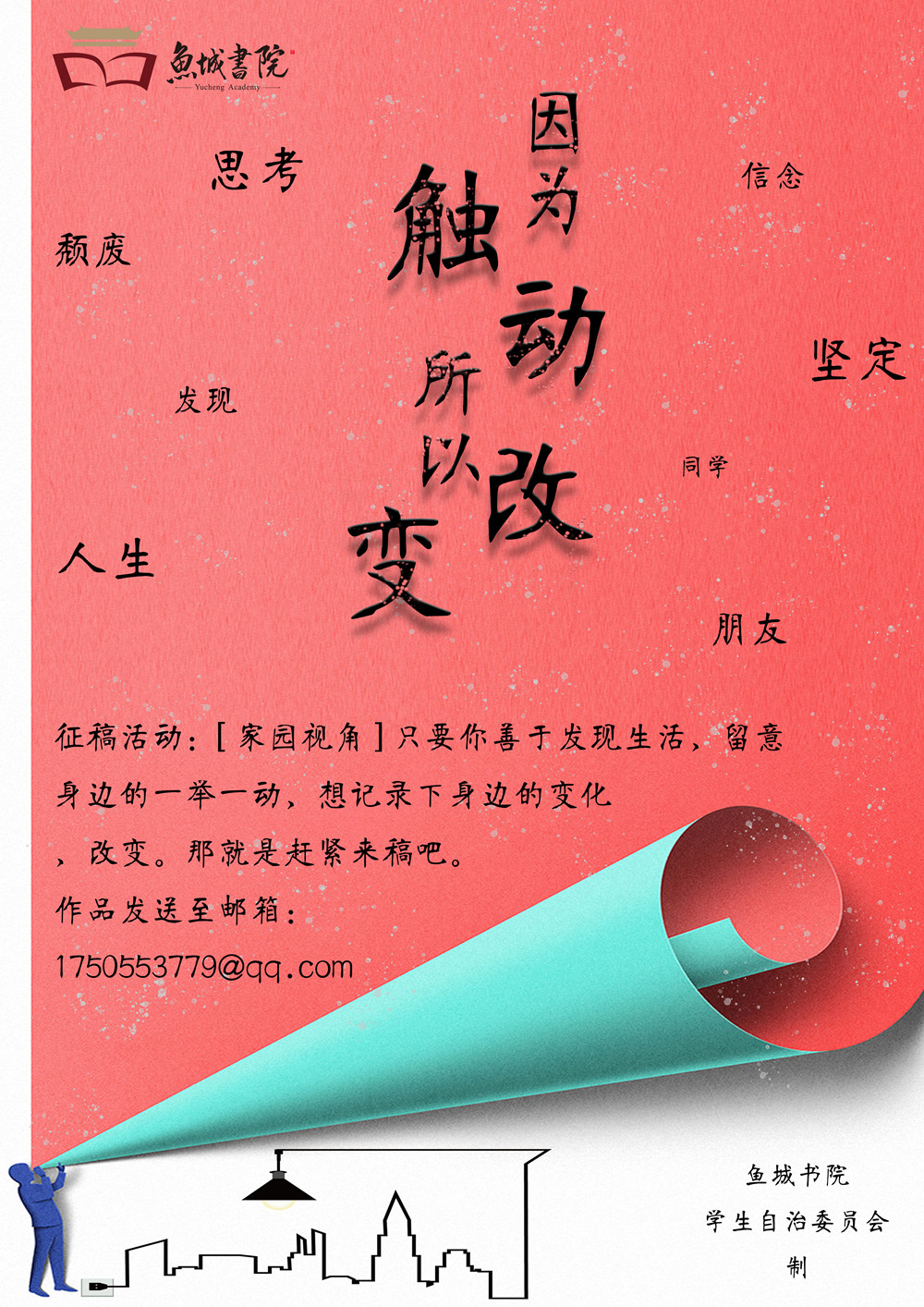 “转换视角,从点滴改变;因容而忍,方近于达观”。为进一步强化书院“家园社区”的文化理念,树立“我是书院的,书院是我的”主人翁意识,更好地缔造“会思考、敢批判、有改变”的鱼城家园,鱼城书院将着力搭建“鱼城学子自我改变计划”之“家园视角”平台,希望发挥学生内驱力,让鱼城学子参与到家园社区建设、维护和自我改变计划中来。“因为触动,所以改变”,让我们共同思考家园社区内的瞬间。