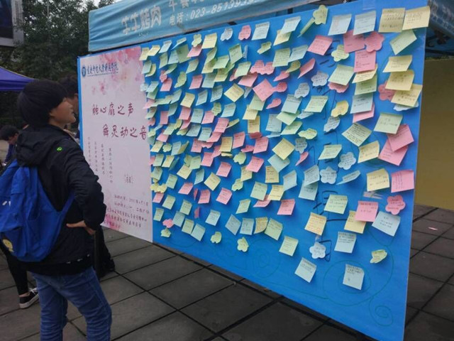 同学们都被此次活动的独有形式所吸引,络绎不绝的参与其中,都在脑海中搜索打动自己的歌词,认真的写上打动的理由;在写下他们心声的同时,似乎写下了一个憧憬的梦,小小的kt板上贴满了同学们的梦,随着风自由晃动,无拘又无束。