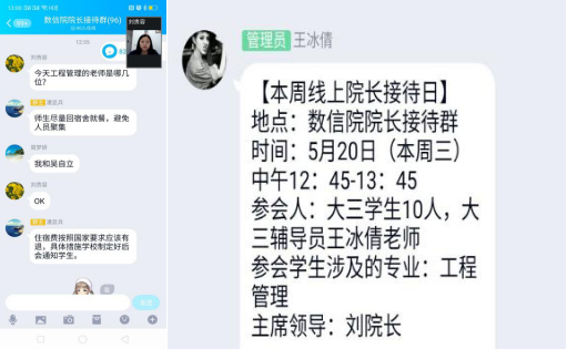 为了解同学们在网课开展过程当中所遇到的问题,以及同学们即将返校所遇到的问题。数字经济与信息管理学院于5月20日12时45分开展线上院长座谈会。参加本次会议的有数信学院院长潘显兵教授、数信学院副院长刘贵容教授、数信学院副院长杨凯老师、数信学院工程管理专业老师吴自立教授、数信学院工程管理教研室主任周梦娇老师、数信学院2017级辅导员王冰倩老师以及2017级工程管理专业的学生代表们。