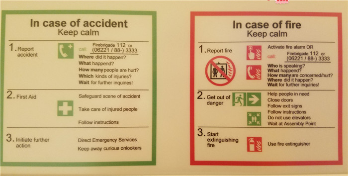 这是楼梯口公寓发生紧急情况的指示牌,制作很是精细专业,内容五花八门,涵盖内容极其周全。包括发生事故如何处理,第一步,第二步,第三步等。发生火灾时如何应对,同样也是第一步,第二步,第三步,都有联系电话,甚至包括事故发生后你拨打电话应该讲些什么都一一列举: Where did it happen? What happened? How many people are hurt? Which kinds of injuries? Wait for further inquires !