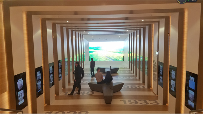 最后给大家展示一个展厅视频播放和休息区域的画面,映入眼帘的场景给人一种时空穿越感,两侧呈现的是宝马的历史图片,远处的视频幕墙则是宝马历史与现实纵横交错的唯美画卷,让你穿越时空,去体验宝马的前世今生,去回味,去想象,去思考。