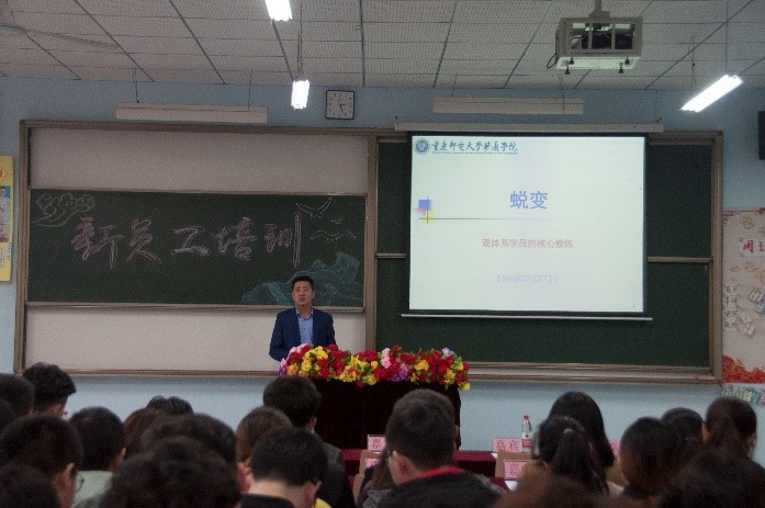 热血沸腾的授牌仪式紧随其后。新学员们依次排队上台,由重庆邮电大学移通学院院长助理周伟老师亲自授牌,学员们胸前的一张张名牌不仅是双体人的象征,更凝聚着双体人不畏艰险,迎难而上的精神。当名牌挂上脖子的瞬间,学员们那份来自双体、来自内心的骄傲与自豪油然而生。