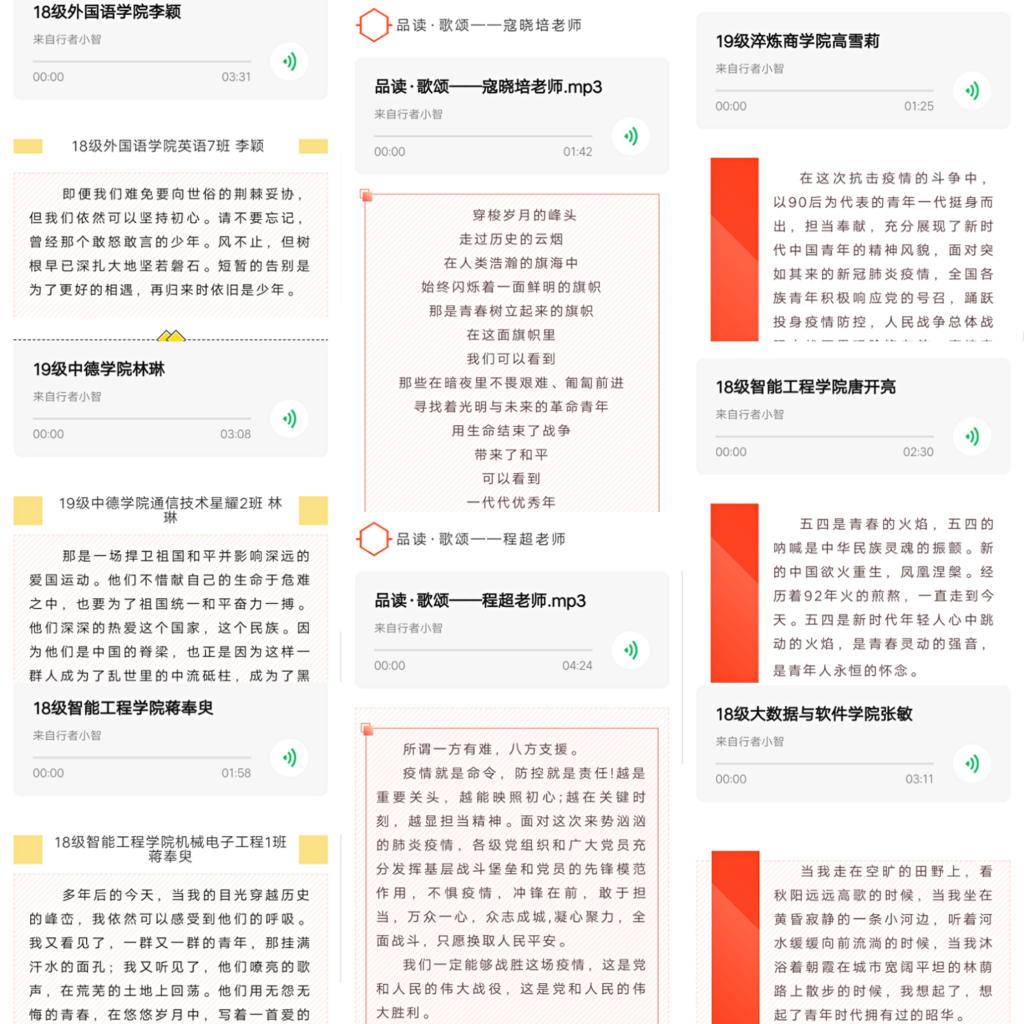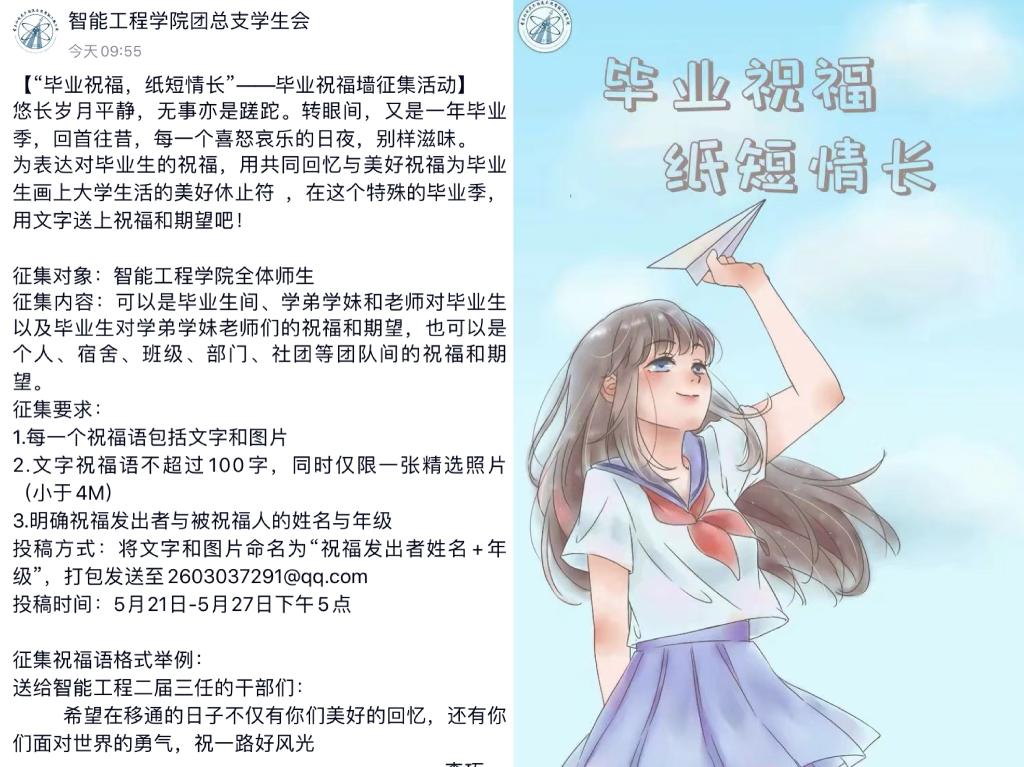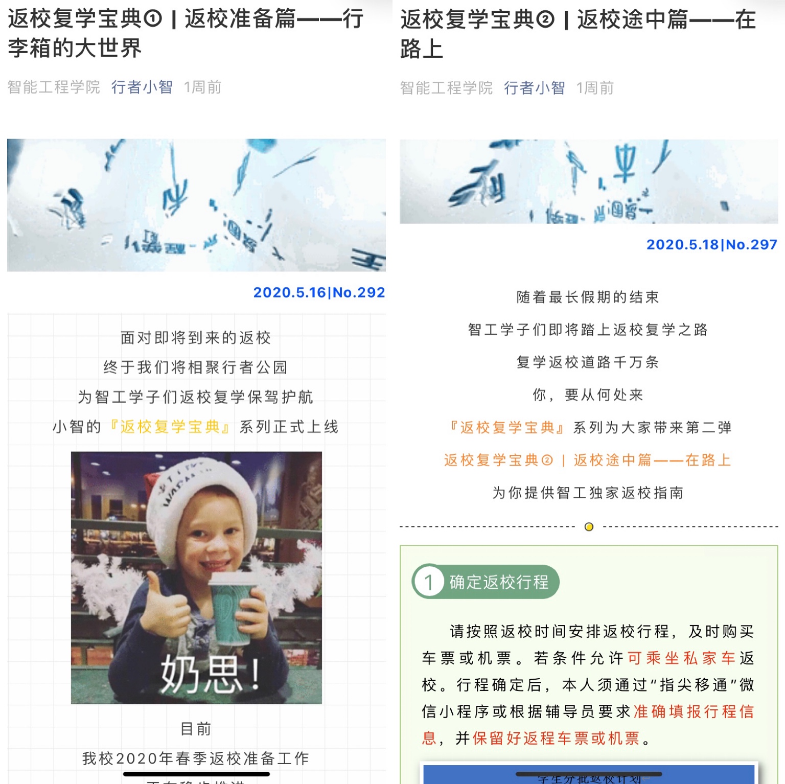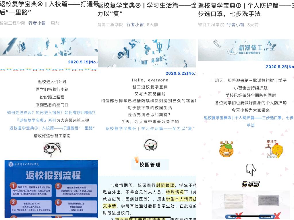 5月,智能工程学院充分利用微信公众平台、官方QQ、学院官网和晓英才进行宣传工作。其中,微信119篇、官方QQ 105篇、学校官网8篇、完满教育官网7篇、晓英才3篇。每周学工战疫纪实已推送第6篇。助力学生返校复学,行者小智推出【返校复学宝典】特辑,事无巨细,从返校准备、个人防护到全力以“复”,融合多方资源,做学生的好助手;【职等你来】招聘放送,打造信息共享新平台。从资源的整合相加到资源的相融,智能工程学院的宣传工作不断推陈出新。