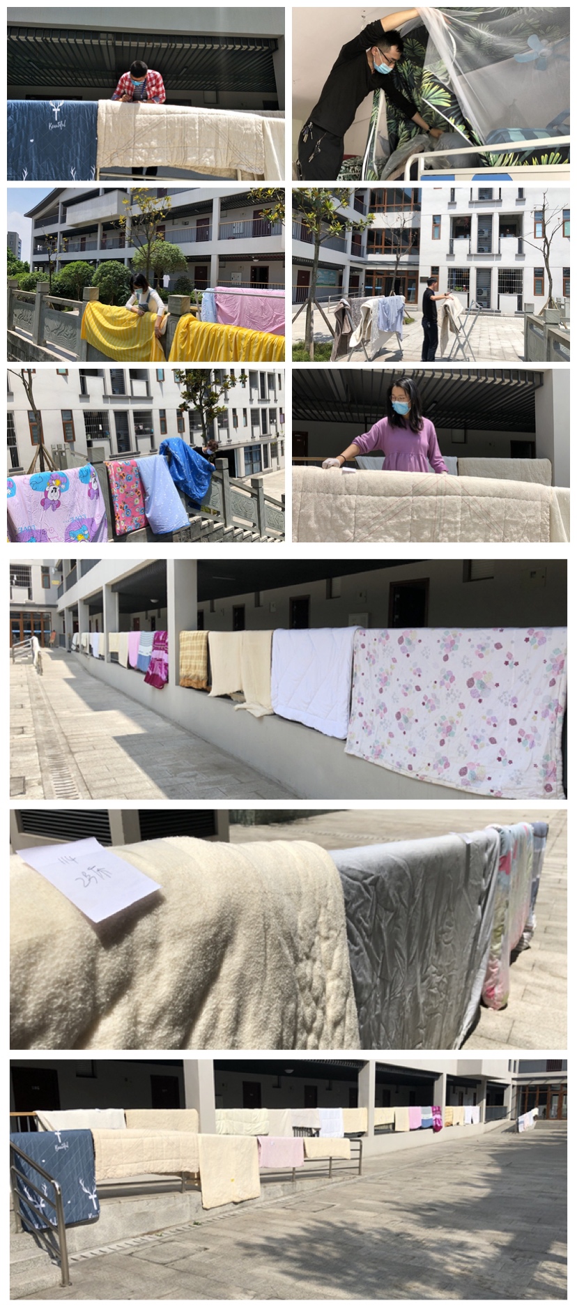 趁着阳光明媚,智工辅导员们开启“云接单晒被子”服务,详细分工、取被子、贴标签、分区域摆放,每一床被子都被“温暖”以待,同样也以暖暖的味道迎接学子。