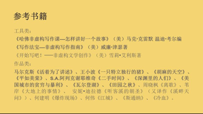 在实际上课中佘老师也是严格这么做的,这让我们都印象深刻。比如,除了前面讲到的选题讨论、采访提纲讨论以外,老师还推荐了一些经典的非虚构作品,并要求每位同学研读,然后再分工,每一部作品由两到三位同学共同主讲。所以,班上每一位同学都至少有一次机会做主讲人。佘老师告诉我们,主讲人主讲的时候他(或她)就是课堂活动的组织者、管理着和引导者,他(或她)就是“老师”,就是课堂上的主人。主讲人不仅仅分享自己的研读成果,而且更要组织同学们参与讨论。同学主讲的时候,佘飞老师会暂时成为一名特殊的“学生”。
