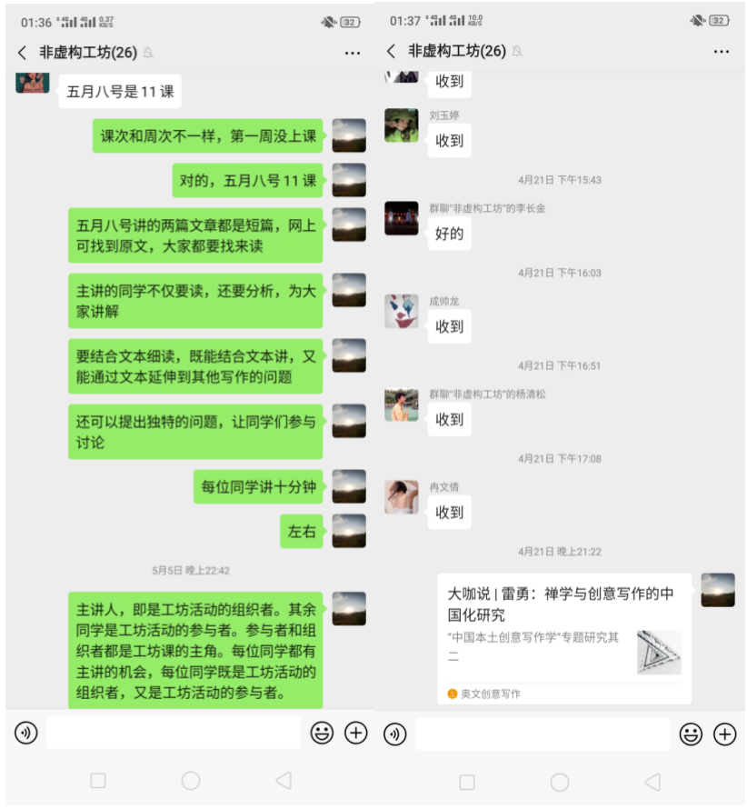 老师还建立了一个微信班群,老师经常会在群里讨论、分享一些与课程相关的内容。微信群仿佛成了我们学习写作的第二课堂。毕竟老师的阅历比我们丰富,老师转发的内容,都是经过他精心挑选的内容,极大地拓宽了我们的视野。“课堂上时间有限,不可能把所有的东西都讲完,我平日看到不错的内容就顺手转发到我们的小群里,大家感兴趣的话就会点开阅读,其实这也是我们课堂教学的一种延伸。”佘老师说。