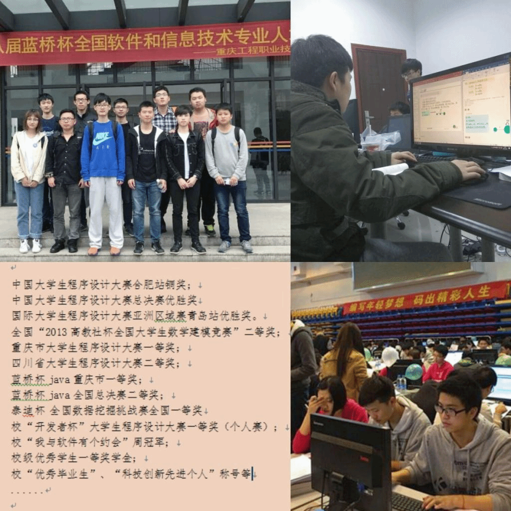 从上高中开始,我就对计算机特别感兴趣,也明确了自己大学的专业方向。高中老师经常会说,“大学就是天堂,可以做一切自己想做的事情”。在进入大学以后,随着对计算机专业知识学习的深入,我发现自己对此也更加痴迷,只要是闲暇时间便常常与计算机为伴、有时候甚至通宵达旦,尝试着各种计算机代码的编写。这一爱好从大一一直坚持到了大四,使我在不断强化专业知识的同时也收获各种比赛的荣誉。如蓝桥杯java全国总决赛二等奖、泰迪杯全国数据挖掘挑战赛全国一等奖、重庆市大学生程序设计大赛一等奖、国际大学生程序设计大赛亚洲区域赛青岛站优胜奖等等。