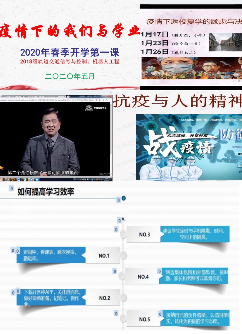 2019级辅导员孙良顺结合期末,向同学们分享提高学习效率小技巧,帮助大家收心调适;2018级辅导员郭菲为2018级轨道交通信号与控制和机器人工程专业的学生带来“疫情下的我们与学业”,生动的课堂上郭菲老师强调精神的重要性,告诫同学们要将刚毅坚卓运用到学习中,利用有限的时间,在疫情环境中,积极学习,查缺补漏。