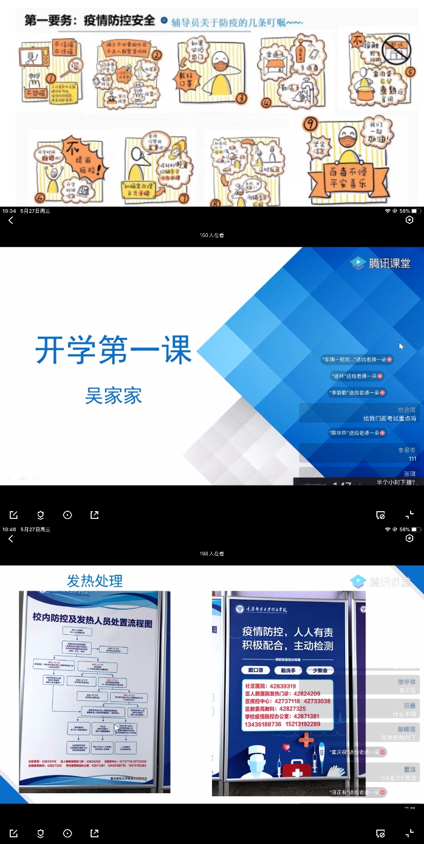 孙良顺老师全方面的从疫情防控安全叮嘱同学们正确对待疫情;刘桃老师详细的复学疫情防控指南,在明确四必要、三坚持、两重心和一保障的基础上,科普疫情防控法律法规,绷紧“意识弦”;吴家家老师在为2017级机械设计制造及其自动化、车辆工程和自动化专业开展返校“开学第一课”时,着重强调寝室晨午检以及水银温度计的正确使用和处理,使大家放心、安心和定心;张颖超老师讲述一系列科学防疫和健康管理知识,助力学生封闭管理下的校园生活。