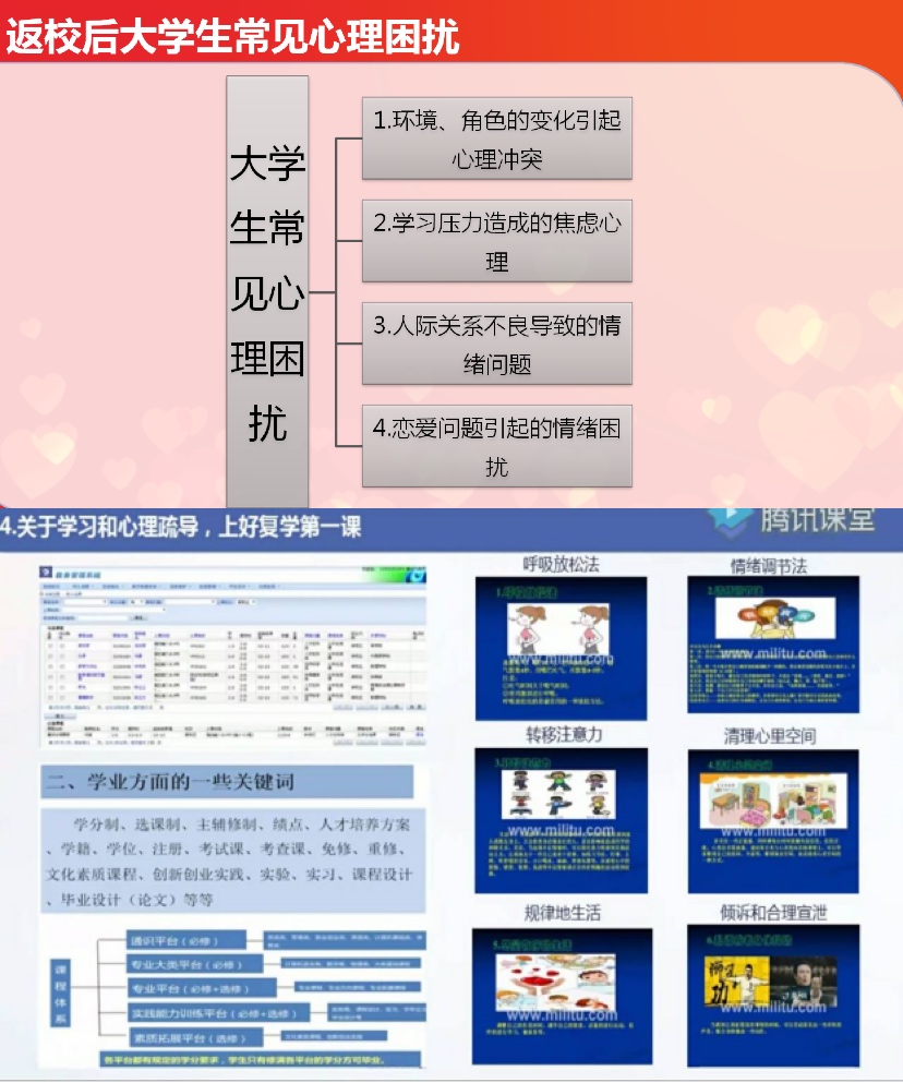 这场空前的危机给人们心理造成的阴影并非短时间内能够抹去,加之许久未进行的集体生活、个人心理焦虑等问题,都会在返校生活中逐渐凸显。面对学生复杂的身心挑战,2017级辅导员粟丹为电气学生们线上直播心理调适,从理论视角分析心理冲突的产生原因,从角色理论告诫同学角色认同和角色转变的重要性,从积极自我和积极情绪视角舒缓学业、人际交往、寝室等出现的情绪困扰,帮助大家找到精神寄托,调配治愈配方,以阳光心态面对生活。