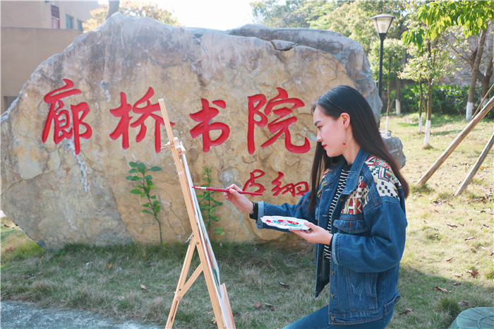 课余的时光同样多姿多彩。下午6点20,在廊桥书院,正值草长莺飞,樱花盛开的季节,崔琴开始画画,通过自己手中的画笔,记录下校园的美丽风光。