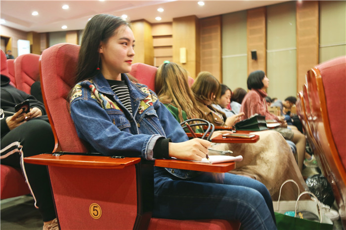 晚上8点,崔琴和小伙伴一起来到下里巴人剧院,听“文化移通----名家大讲坛”163讲,演讲嘉宾是《诗刊》杂志社编辑彭敏。他曾获中央电视台第二届中国成语大会年度总冠军、第三届中国汉字听写大会媒体竞赛团年度总冠军、第二届中国诗词大会亚军。崔琴专注聆听、认真笔记、积极互动,充分吸收着名师大家给予的知识盛宴。“来我们学校讲座的很多都是不同领域的知名专家学者教授,一场讲座虽然两个小时,但对于我来说受益匪浅。”