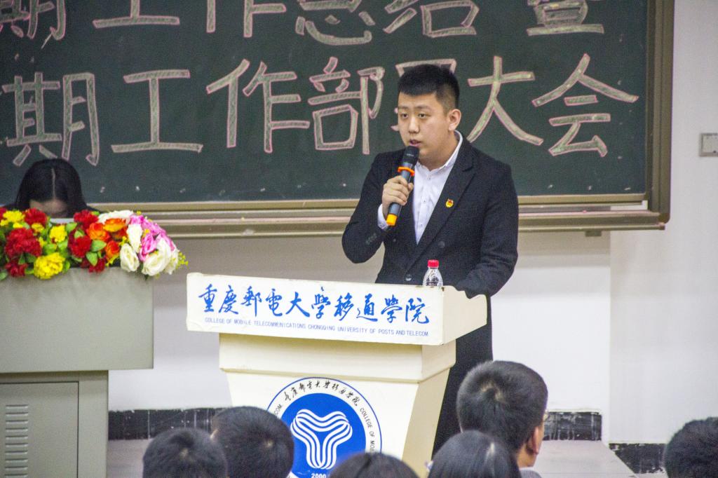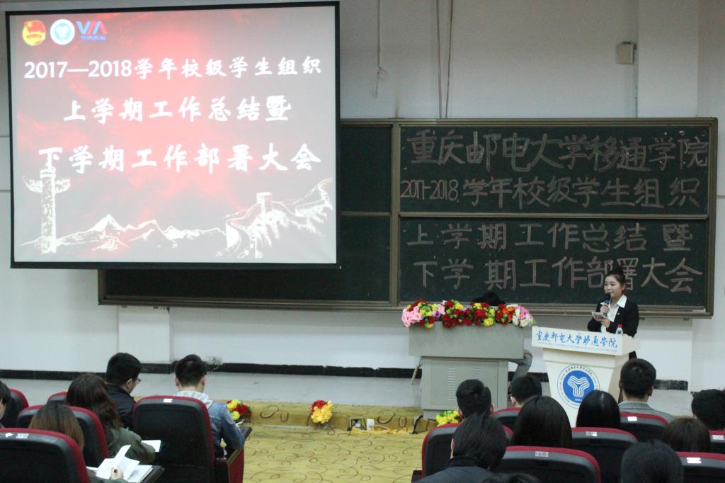 上午9:00,重庆邮电大学移通学院第三届第二任校级学生组织全体干部在第三教学楼3203教室进行了2017-2018学年上学期工作总结暨下学期工作部署大会。校级学生组织代表分别从组织建设、宣传推广、团学改革、品牌活动建设、志愿服务、竞技体育、宿舍管理、书院建设等方面就本学年两学期的工作进行总结与部署。学生组织的每一个人都在总结中收获成长、领悟新生,并为第二学期的工作提供经验,从而更好地为完满教育服务。