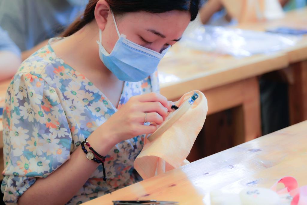 在手工制作过程中,口罩绳子的缝合对于同学们而言有一定的难度,单大琼老师拿着绣口罩的布料和口罩绳子仔细为同学们讲解,反复示范,确认绣口罩的同学们能够正确缝合 口罩绳子。在老师耐心讲解着,同学们聚精会神的听着,手里的动作也没有落下,一步一步跟着老师的指导,口罩组的同学们很快便掌握了口罩的绣制方法。