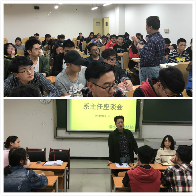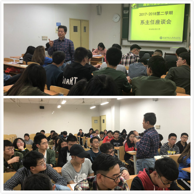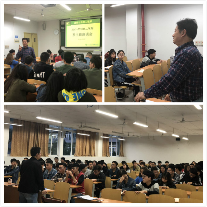 为了更好地了解我系大一同学的学习和生活状况,3月21日晚上,通信与信息工程系在4301教室如期开展了系主任座谈会活动。这次交流,完全没有通常会议的严肃氛围,恰恰相反,它更像是一次朋友间亲密无间的聊天。系主任毛期俭教授、学工办主任何燕老师、系主任助理李文娟老师、电子信息教研室主任高飞副教授、教学秘书李佩婷老师和教师代表赵瑞玉副教授一起参加了此次座谈会活动。