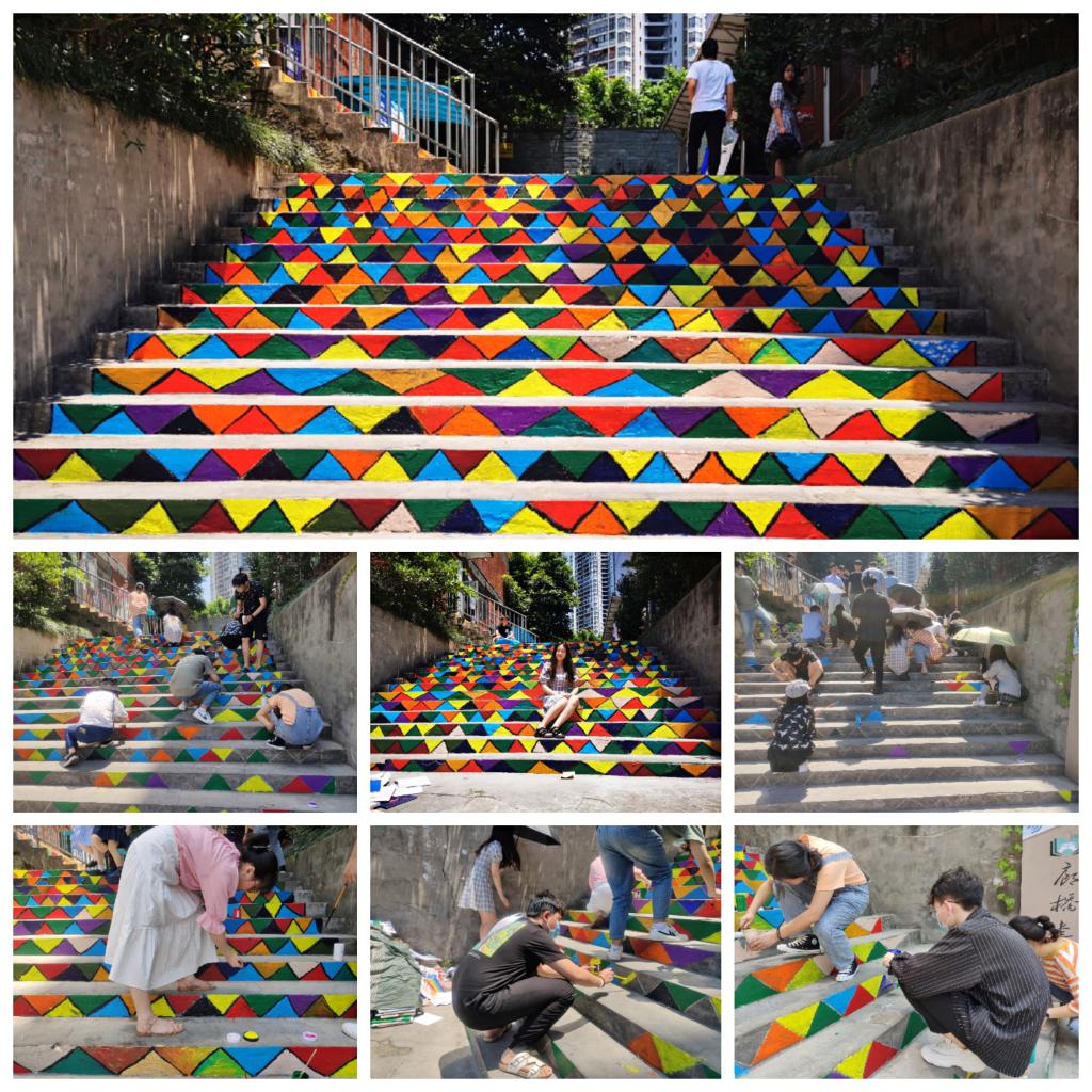 当大家勾勒完最后一笔时,这副画也呈现在大家面前。“我给你说,这一块黄色的是我画的。”被邀请参加画画的学生给他的室友炫耀。“你们画这么好看,我们都不好意思踩了。”过路的同学纷纷表示对这幅“作品”的赞许。这不仅仅是毕业的学长为廊桥留下的礼物,更是住在廊桥的学子们为自己创造的礼物。