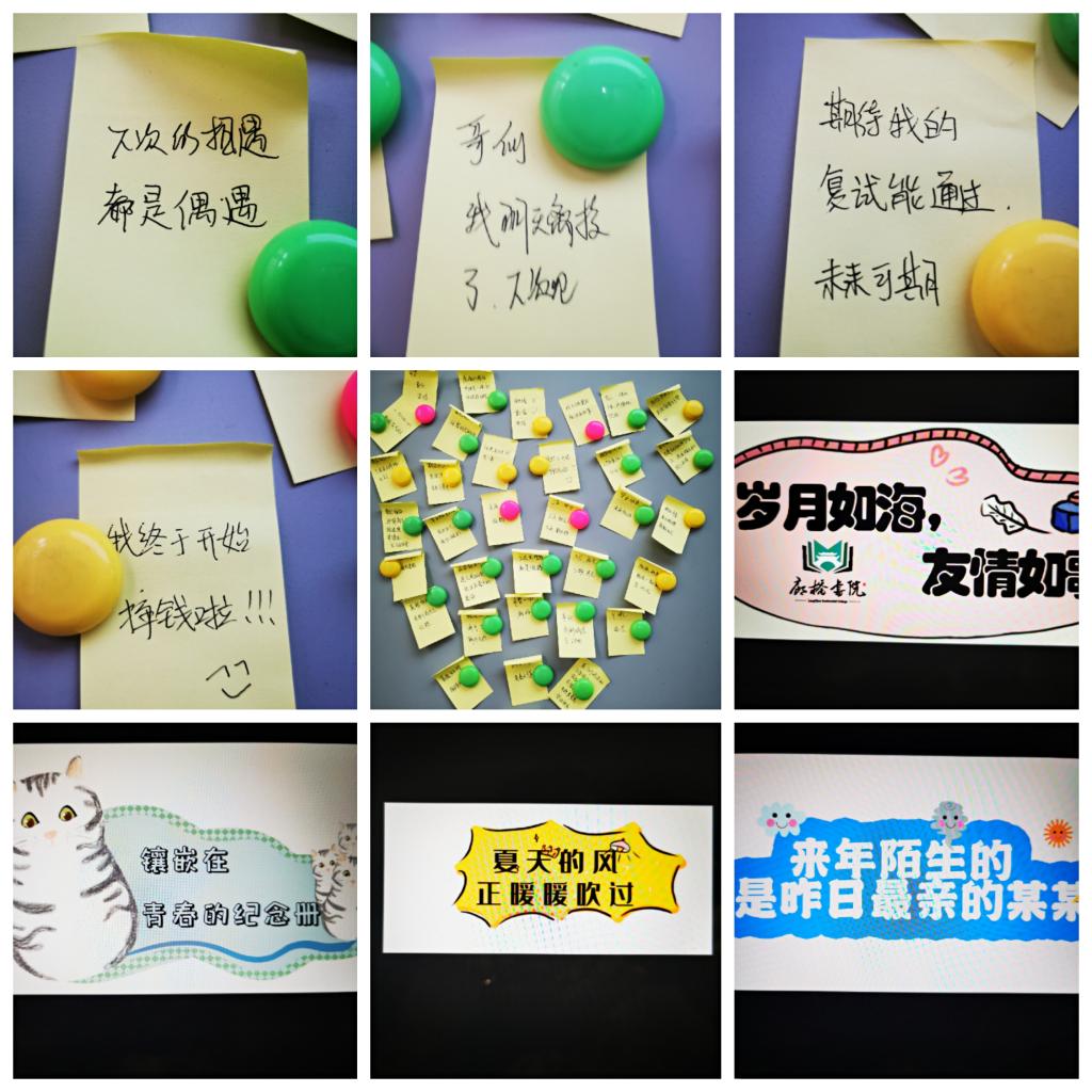 廊桥寄语:“希望你们心想事成”;6月2日,“心愿廊桥”正式启动,书院联络了未离校的毕业生,其中有等待研究生复试结果的,有等待开始下一阶段进程的等待,每个人的心中都有一个远大的梦想;通过收集他们的心愿等,通过叠纸飞机、写心愿贴的方式,将自己的愿望寄托于纸飞机,让纸飞机载着梦想前行;这也是他们对自己未来的期盼,希望他们能大胆的去创造属于自己的生活,在工作中百尺竿头,更进一步。