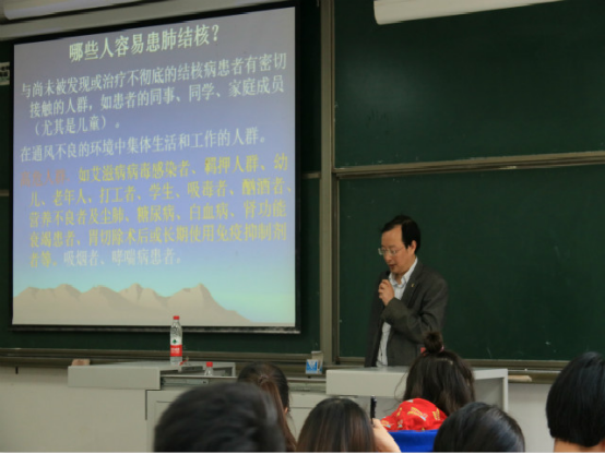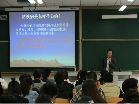 讲座开始陶主任从多方面让同学们了解结核病。结核病俗称“痨病”,是一种传染病,严重时可导致死亡。它的表现为咳嗽、咳痰、咯血,并且可以发生在人身上的任何部位。还列举了同学们所熟知的人物患有结核病的案例,如林黛玉、孙中山、鲁迅。又从生物学角度为我们剖析了结核杆菌的大小、结构、形状。字形图相结合,使同学们更加形象的了解结核病。