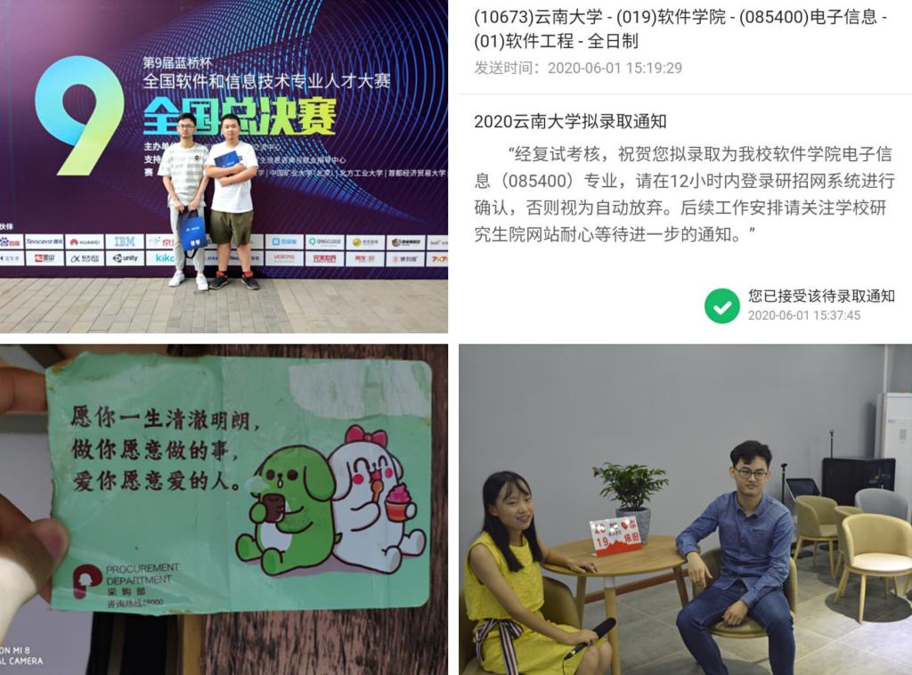 2019-2020学年第一学期,北山书院学习信息管理与信息系统专业的王杰琨同学,一边在北山书院功能室准备考研,一边帮助北山书院开发线上功能室预约系统。他曾担任“指尖移通”微信小程序开发团队组长,创造3万余名学生使用的成绩。200余天奋斗岁月的沉淀,6月初,他以初试270分,复试综合成绩63.96分的成绩成功被云南大学录取硕士研究生,攻读电子信息(软件工程方向)专业。在知晓喜讯的当天,他第一时间找到北山书院老师,表达喜悦和感恩之情。