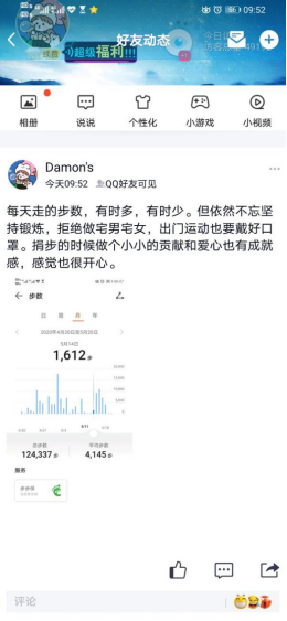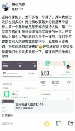 本次活动于5月25日-5月27日举办,共50余人参与。活动期间,同学们以说说或者日志的形式在QQ空间分享一条围绕“运动、健康、抗疫”等相关的主题的运动经历或抗疫故事,运动数据、照片、视频等。用自己的真情实感概括了自己数月以来的运动心得以及对健康、抗疫等相关主题的所见所想等。