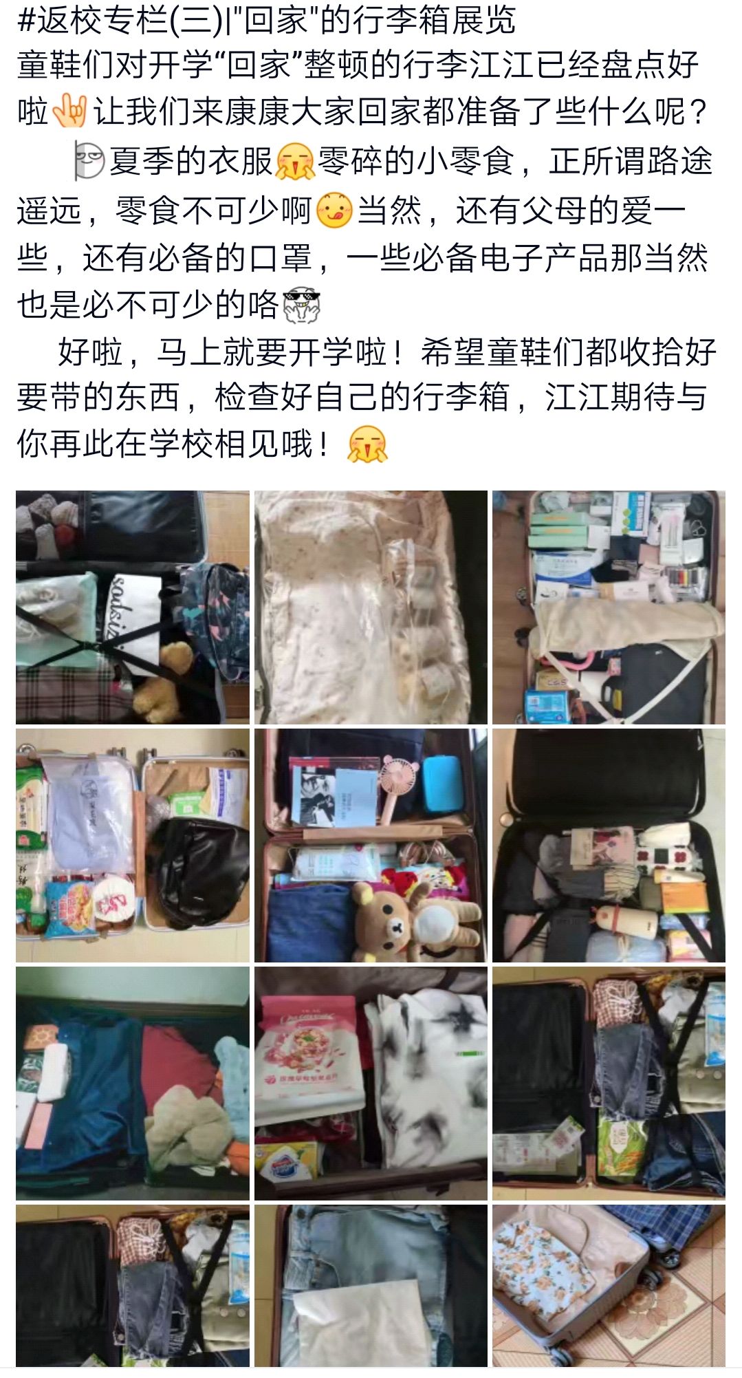 5月21日至25日,“晒出行李箱”活动持续进行,通过征集和集中展示返校行李照片的形式,让同学们感受到了书院的家文化氛围,传递了“回家”的温暖。汇江书院2019级的李瑜同学说,在学校吃饭的时候会经常想念妈妈煮的面条,于是在行李箱里也放入了泡面,这既是当代大学生的一种默契,也是对家的思念。一包口罩和一盒常备药品是来自妈妈的关爱,两本书籍承载着思想的力量,家人做的小零食、陪伴自己跨越千里的布娃娃,行李箱里装满了生活、梦想、温暖和爱,这是每个人大学生活的缩影。