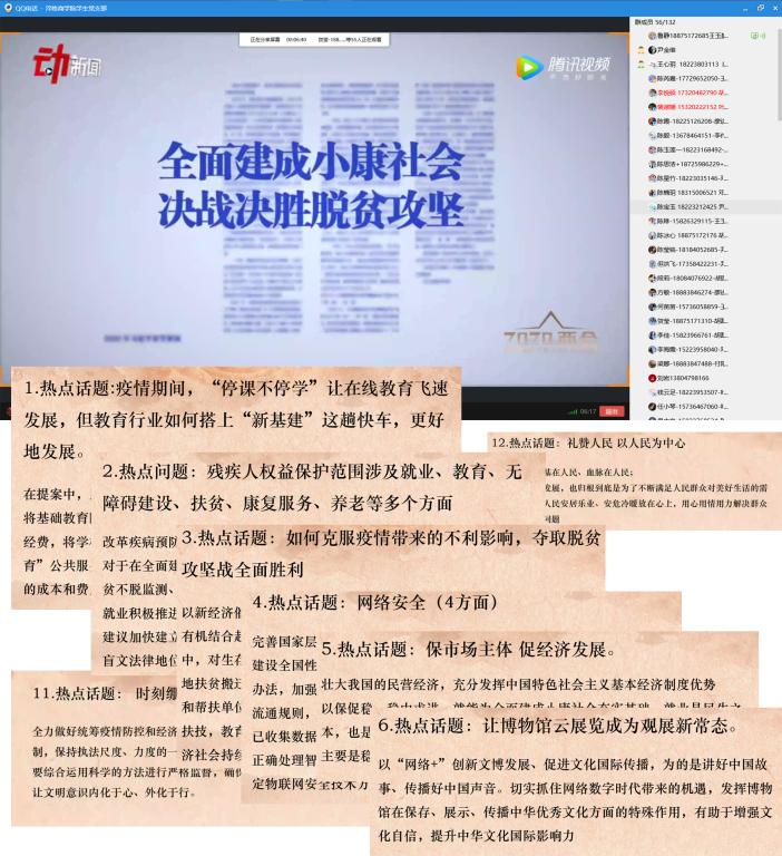 为学习贯彻全国“两会”和习近平总书记重要讲话精神,积极贯彻全国两会精神会议的各项部署要求,树牢四个意识、坚定四个自信、做到两个维护、学好理论,注重实践,以行动出效果。2020年6月10日下午4点,淬炼商学院学生党支部在线上展开了以“‘中国梦·我的梦’学习两会精神·关心国家大事”为主题的主题党日活动。