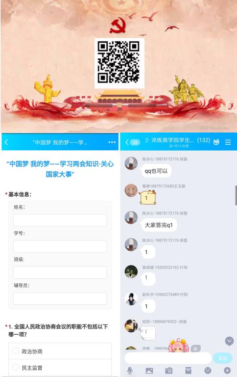 在学习了诸多两会热点之后,为拓宽知识面,同时考察各学生党员对于两会知识的掌握程度,本次主题党日活动针对两会相关知识进行了线上答题环节。每位学生党员通过扫描问卷二维码的形式,积极参与线上答题,在答案提交后,后台会根据回答结果自动给出相关解析,以便各党员同志自测后可以对答错的题目进行订正并记录,巩固此次会议所学的知识。在答题过程中,各学生党员在党支部群内积极回复答题情况,充分调动了学习思维,激发了答题热情,逐渐将活动的氛围推向高潮。
