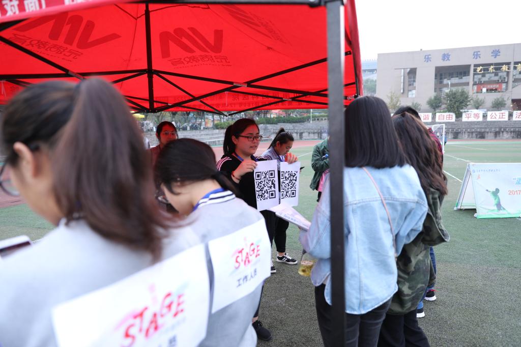 活动开始,陆续有观众进场,工作人员组织同学们扫码签到登记信息。