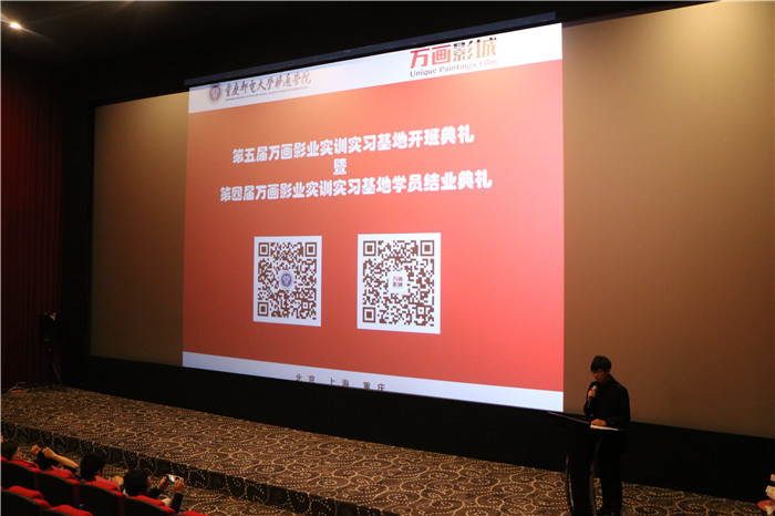 3月28日下午,在万画影城三号厅,我校联合重庆万画缤果城影业有限公司隆重举行了第五期万画影业实训实习基地开班典礼暨第四期结业典礼。院长助理兼教务处处长刘枚老师,教务科科长卢中玲老师,北京万画影业投资有限公司张燕副总经理,重庆万画缤果城影业有限公司影城经理杨磊经理以及万画培训导师,近200名学员参加此次典礼。