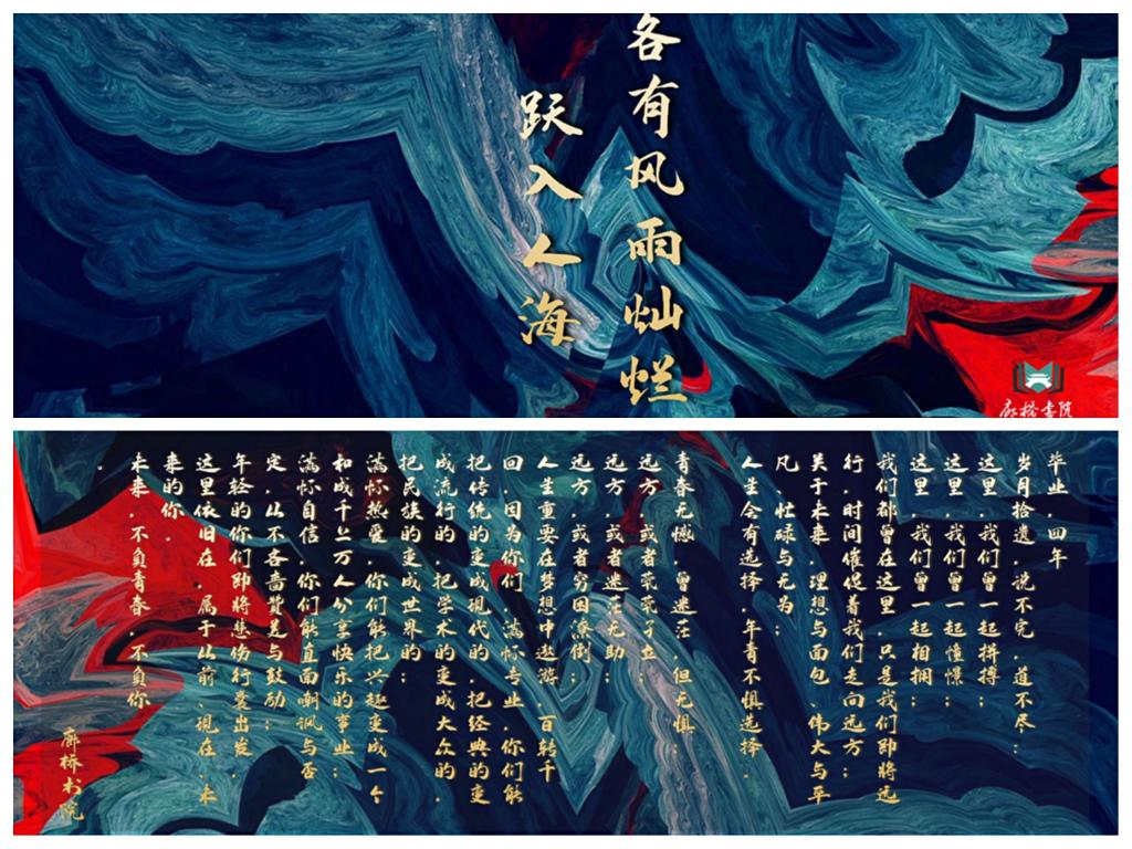 “毕业,四年,岁月拾遗,说不完,道不尽;这里,我们曾一起拼搏;这里,我们曾一起憧憬;这里我们曾一起相拥;只是我们即将远行,时间催促着我们走向远方,人生会有选择,年轻不惧选择。青春无憾,曾迷茫,但无惧;年轻的你们即将走出,这里依然属于从前、现在、未来的你;未来,不负青春,不负你。”