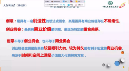本次沙龙采取线上讲解及群内互动的形式,首先杨德龙老师通过当下较火的“地摊经济”引发同学们思考,同时结合“饿了么”等经典案例介绍了创业项目的来源,“创意”与“创业”的概念及区别,一步一步将同学们引入更深层次的思考。