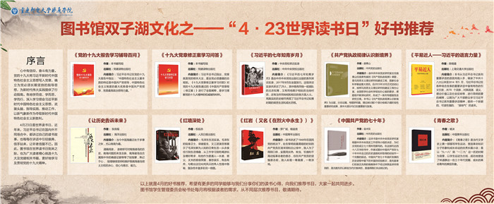 一是开展了以“践行十九大”为主题的“4.23世界读书日”好书推荐栏目。深入践行十九大精神,围绕中国特色社会主义新时代理论体系,让全校师生读者深入学习贯彻落实十九大精神,从思想上统一,行动上专一,增强“四个”意识。