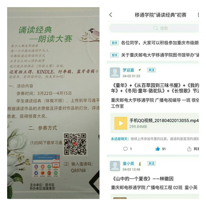 学生通过超星“学习通”视频上传的形式展示诵读作品,诵读时长不超过5分钟,根据诵读作品点赞数及评委对作品的打分。参与的形式都是通过线上完成,不仅丰富了校园文化生活,提升文化校园内涵,还展现当代大学生良好的精神文化风貌,培养其对经典文学的阅读兴趣,增强了网络与学生之间的有效互动,树立当代大学生正确的人生观、价值观和道德观。