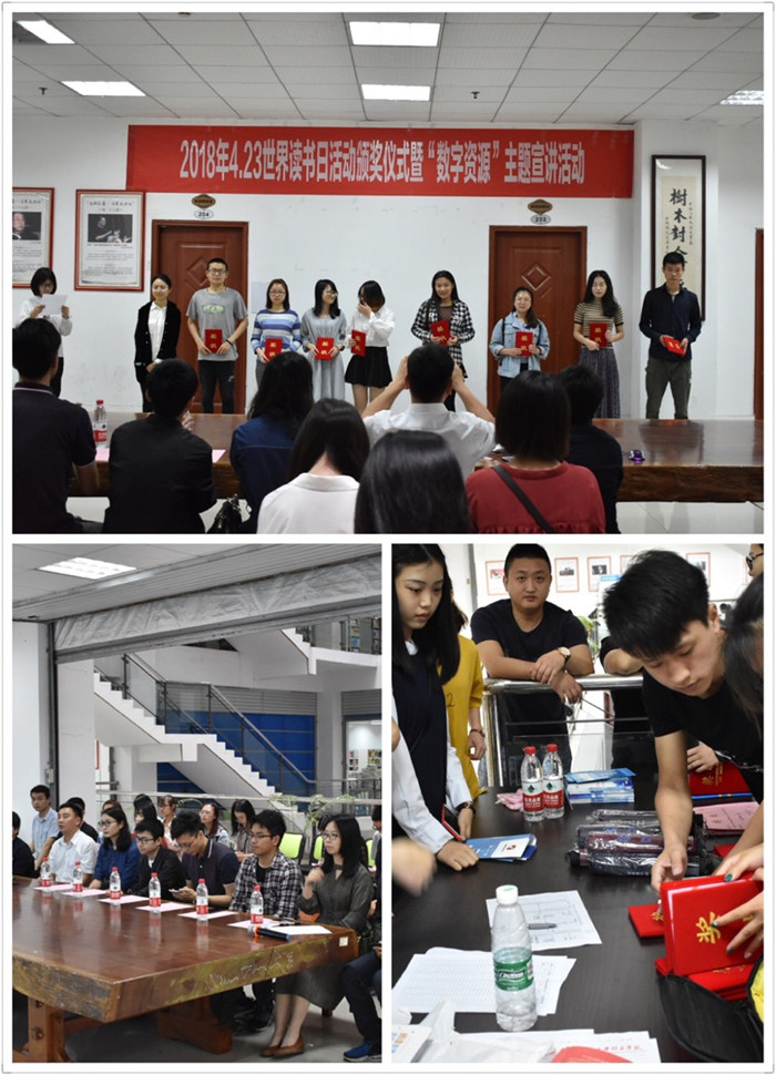 一是阅读推广系列活动颁奖仪式。为弘扬读书精神,营造积极向上的阅读氛围。4月20日,图书馆举办了“4.23读书日系列活动”颁奖典礼。此次活动是对这学年开展的读书活动进行总结,对举办的比赛进行奖励,举办的比赛有“我与图书馆有个约会”征文大赛、“最美三行情书”大赛、图书馆“诵读经典”朗诵大赛、2017年度读者借阅排行榜等四项比赛活动。
