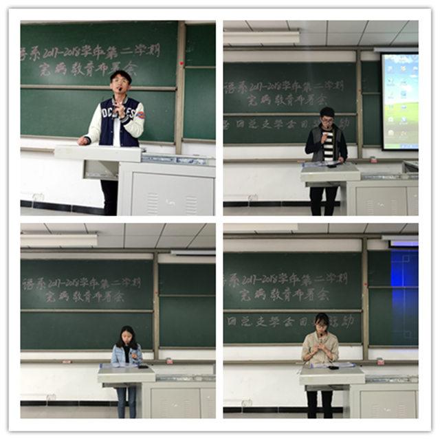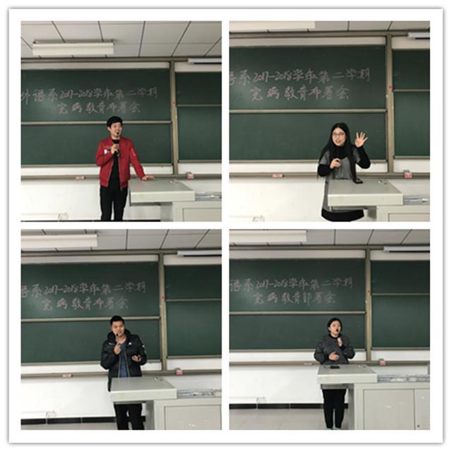 下午14:30,所有人员齐聚5105教室,举行了外语系2017-2018学年下学期完满教育工作部署大会,主席团成员对上学期的工作进行总结,对新学期的各项工作进行部署。负责社团活动的谭秋涛副主席提出不管是主席还是干事都有主人翁意识,不忘初心,坚持到底;分管志愿服务的陈星宇书记提出在新学期志愿服务在保证志愿服务全民化的同时,要向着“新”、“质”、“合”三个方向努力;艺术和竞体负责人罗富冬副主席明确提出我系在这两块工作中的目标:“全民参与,勇争第一”;谷穗副书记对组织建设和宣传调研工作进行总结,她提出,在新学期,组织建设要抓阵地建设,班团基层活力和团总支学生会内部建设是关键;宣传要重实效、重内涵,外媒要打通,调研要以问题为导向,精准发力。