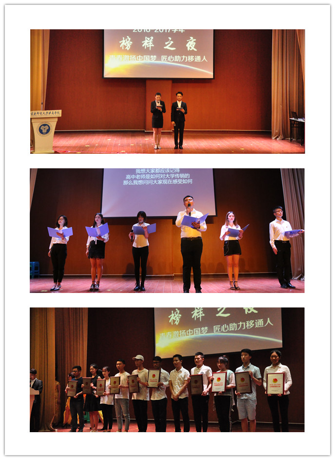 为表彰先进典型,树立榜样力量。同日晚19点,我校于下里巴人剧场隆重的开展了“榜样之夜暨五四表彰大会”。当团歌在会场响起,看着屏幕上播放的视频,回顾过往的风采。五四精神是他们不忘的坚持,这些个人和团队时刻不忘自己的职责,牢记自己的使命。团委书记李文豹老师上台宣读了表彰文件,优秀代表们是完满之路上虔诚的传道者,是每一位共青团员心中的榜样,他们在完满道路上积极坚守,他们就是优秀的共青团员。