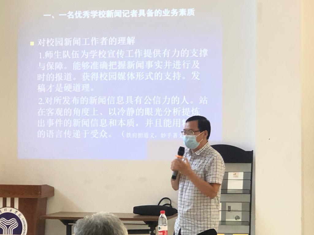吴院长首先向在座老师们介绍了讲座主题及其重要性,以及主讲人在校园新闻传播和学校品牌营销方面做出的成绩和贡献。接着,苏部长分别从学校新闻记者的基本素质、新闻线索的发现、基本写作知识、应注意的问题和新时代背景下的新闻创新五个方面为大家展现了校园新闻传播的基本结构及其魅力,让大家对校园新闻的撰写有了更全面、更系统的理解与把握。
