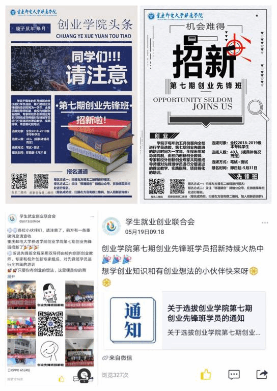 本次第七期创业先锋班招新于5月12日开始进行线上宣传,历经20多天,有100余人报名参加。以QQ说说、移通就创微信公众号、转发朋友圈等方式进行宣传,便于我校学子了解第七期创业先锋班学员招新的相关内容,并进行线上报名。