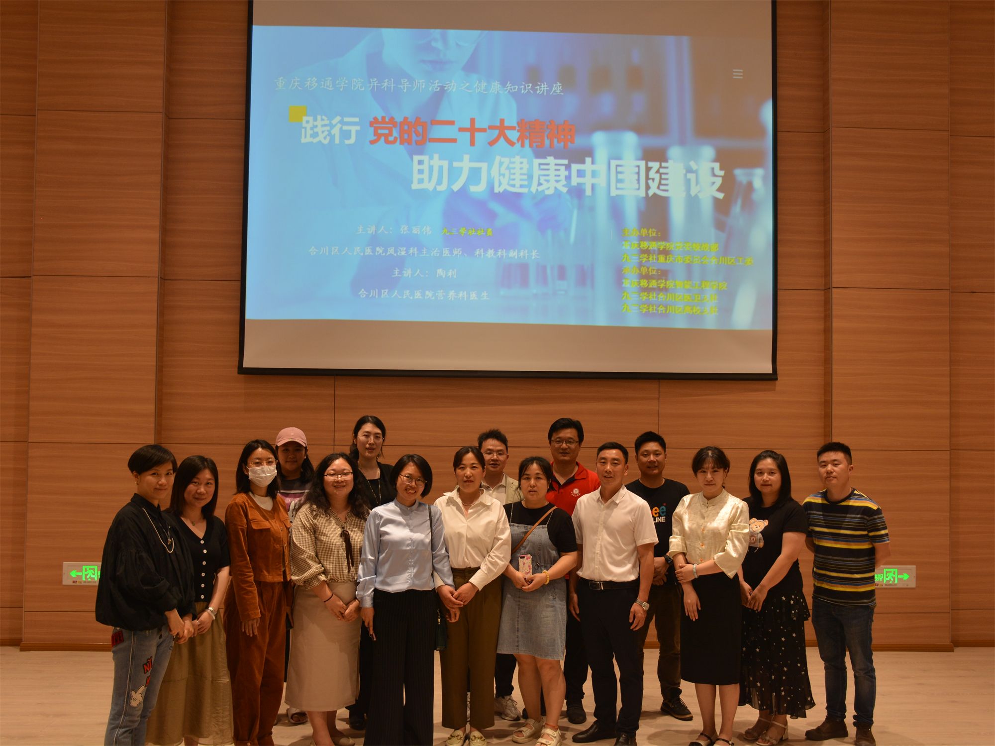重庆移通学院党委组织宣传部部长、品牌营销中心主任苏述庚,重庆移通学院党委统战部部长、图书馆馆长秦代辉,九三学社重庆市委员会合川区工委副主委、合川区民政局副局长陈瑜,九三学社重庆市委员会合川区工委办公室主任唐吟秋,重庆工商大学派斯学院外国语学院副院长李卓以及移通学院教师代表及九三学社社员参加了活动。在活动尾声,智能工程学院青马工程学员黄艺说道:“这次健康讲座切实提高了我们大家的健康意识,提高了大家对自己身体健康的重视!让我们一起深学笃行党的二十大精神,共筑健康中国梦!”