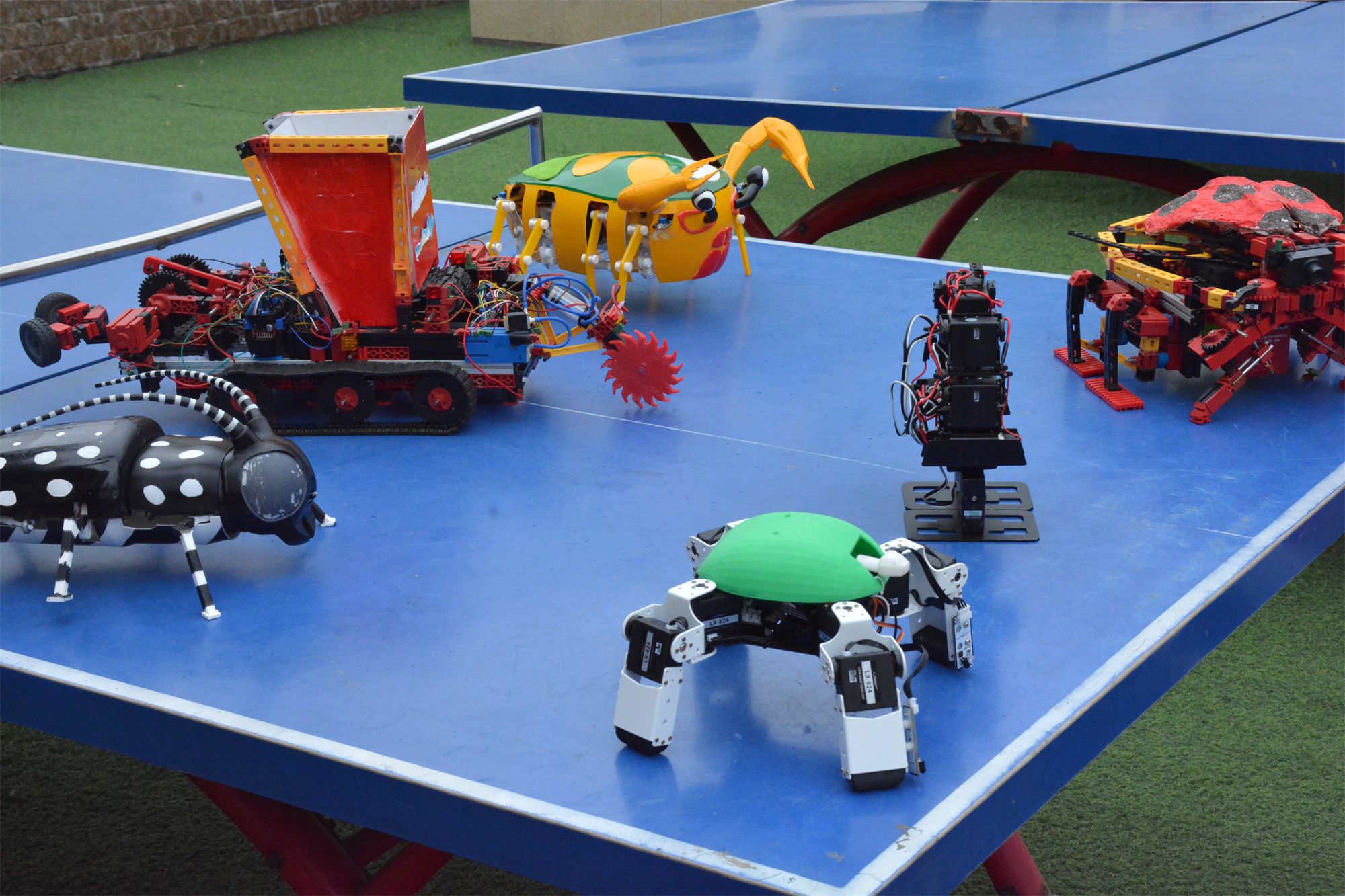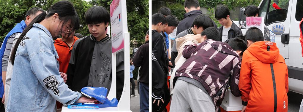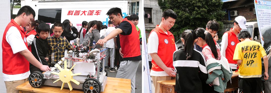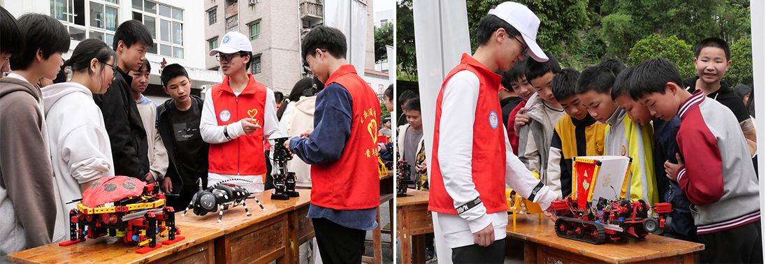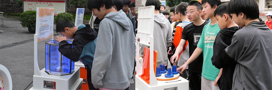 智能工程学院发挥学科竞赛优势,志愿+专业相结合,将多项国赛科创作品带进校园进行了展示。隆兴中学的学生们见到这些作品时,产生了浓厚兴趣。“会跳舞的回形针”、“反应力测试机”、“合作转动的机械”、“机械伸缩花”等,充满了趣味性、互动性。“智能避障螃蟹”、“仿生天牛”、“光之翼-生态仿生瓢虫”等作品,因外表酷似生物,吸引了众多学生的目光,生物与机械的结合,也为未来的机器人发展方向增添了一抹色彩。“多足仿生舞蹈机器人”、“‘沙漠卫士’全自动智能草方格铺设车”、“水陆两栖智能垃圾处理装置”等作品,久经战场,斩获多项国家级、省部级奖项,实用型机器的研发制作,也将助力社会发展,提高效率。