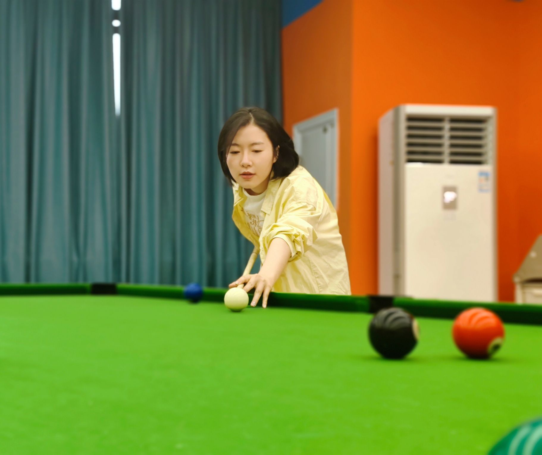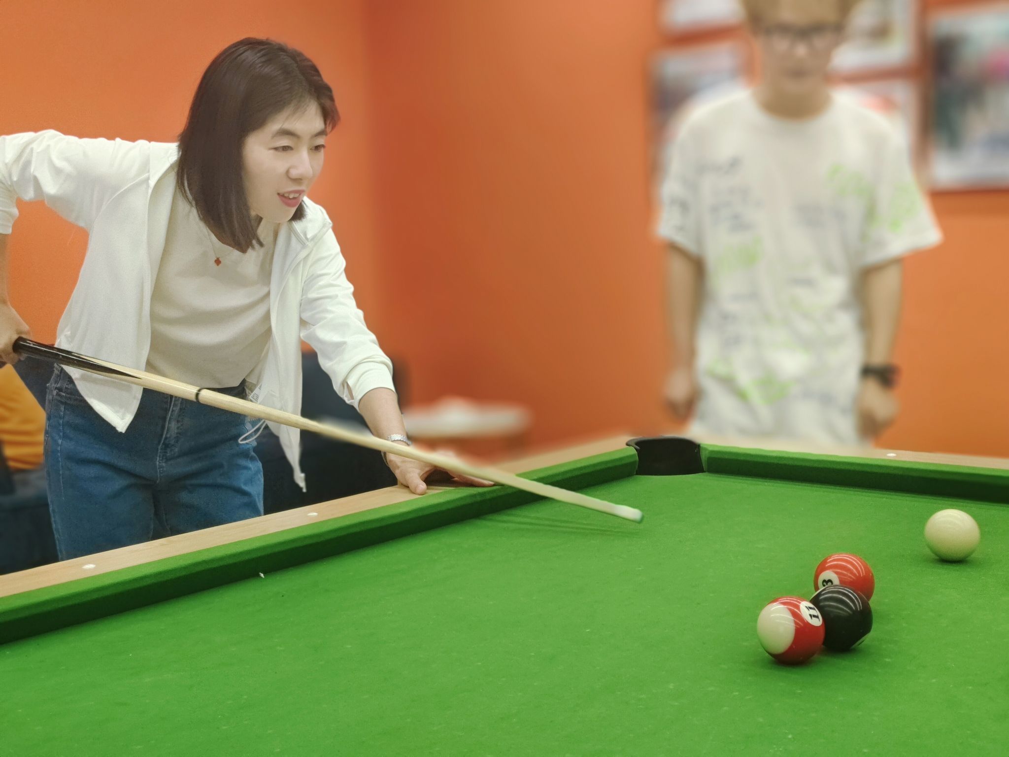 随后移步至台球桌旁分组进行实战演练。部分师生第一次沉浸式体验台球运动,由李俊峰、姚晶同学担任小组长,从握杆、打球姿势及击球技巧等方面一对一带领队员学习,队员们突破紧张、自我挑战,在一次次实践中越发精准。随后分为两队,开展对战,队长、队员纷纷进球,迎来欢呼和掌声。