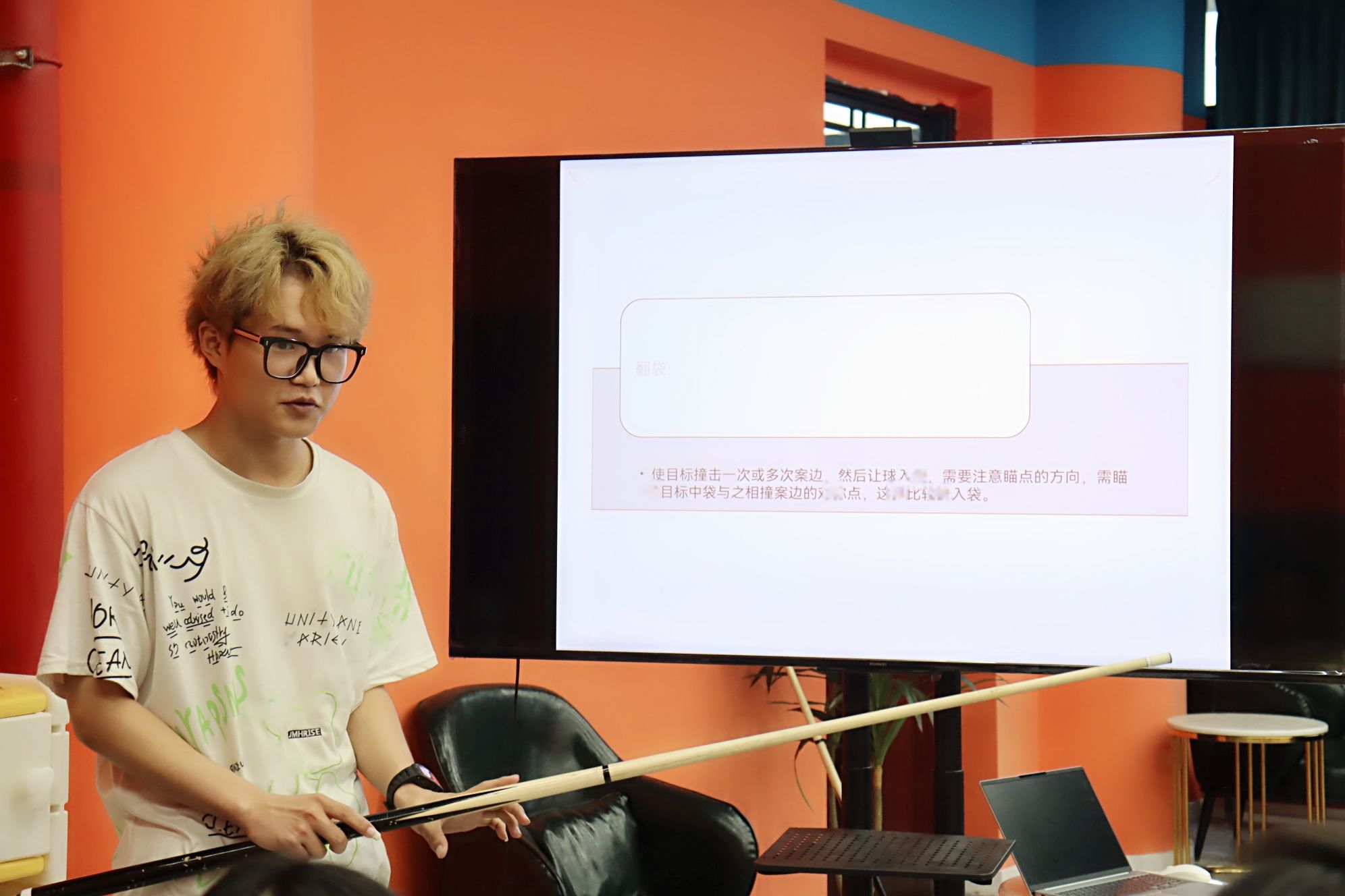 活动伊始,来自艺术传媒学院2022级数字媒体艺术6班的台球爱好者李俊峰同学,以“202X无限魅力——我们相约在桌球上”为主题为大家分享台球知识。台球是一种室内体育运动,也叫桌球、撞球,是一种用台球杆在台面上击球,依靠计算得分来区别比赛胜负的室内娱乐体育运动项目。台球已发展为中式八球、俄式落袋台球、英式落袋台球、开伦台球、美式落袋台球和斯诺克台球。之中斯诺克台球比较普通,已变成一项赛事。通过该项运动器材介绍和基础知识讲解,从握杆、架杆、打球规则等详细讲解,过程中老师、同学们不断发问,李俊峰同学耐心解答,通过讲解冲球、翻袋、传球、反弹、旋转等专业技巧和打法,让师生跃跃欲试。