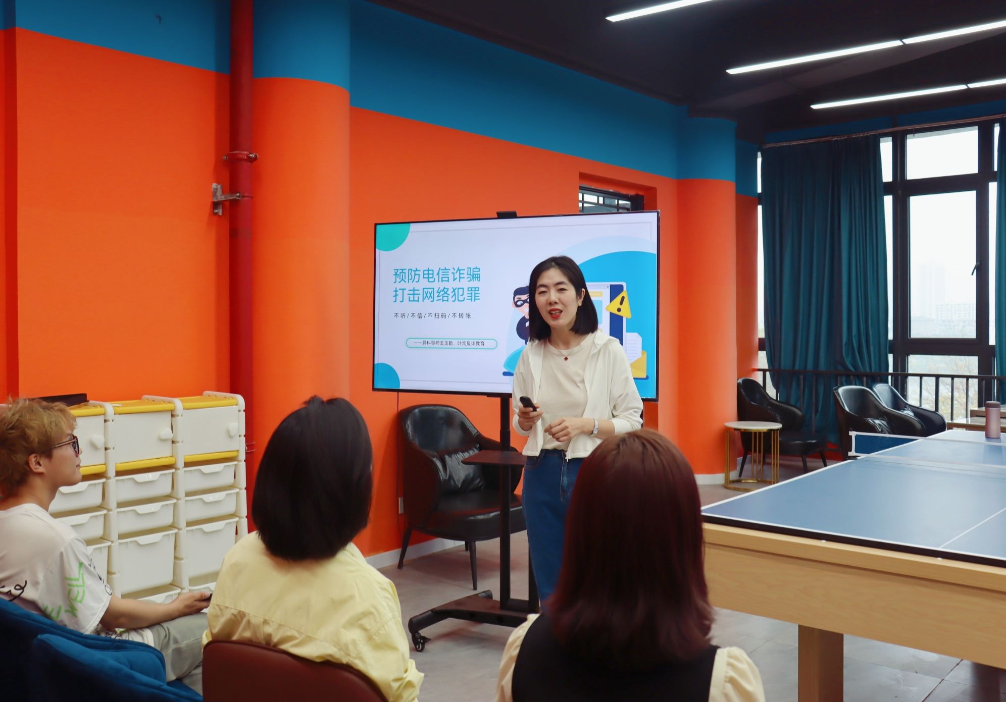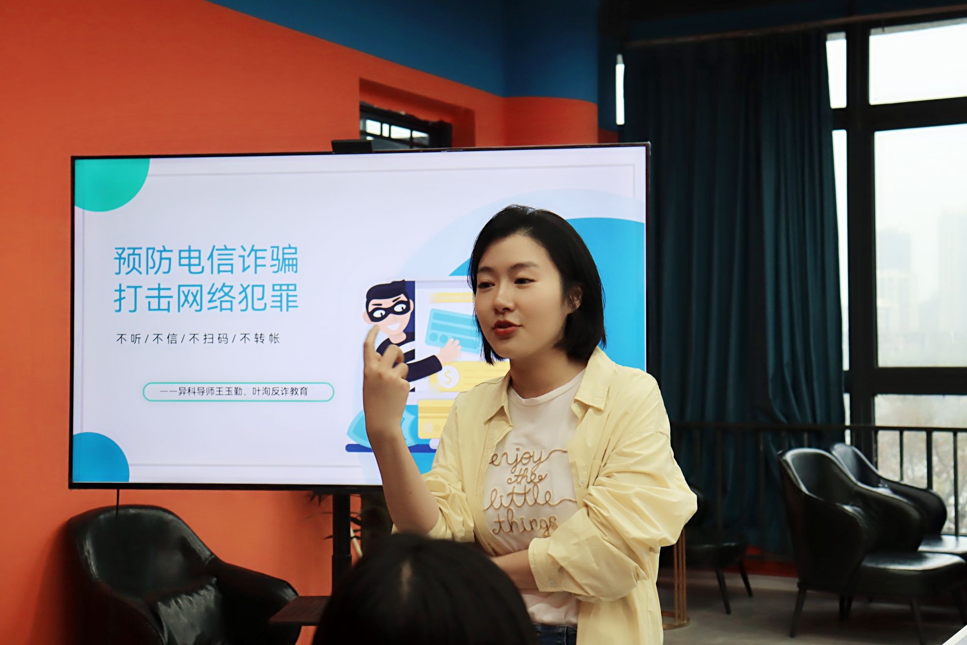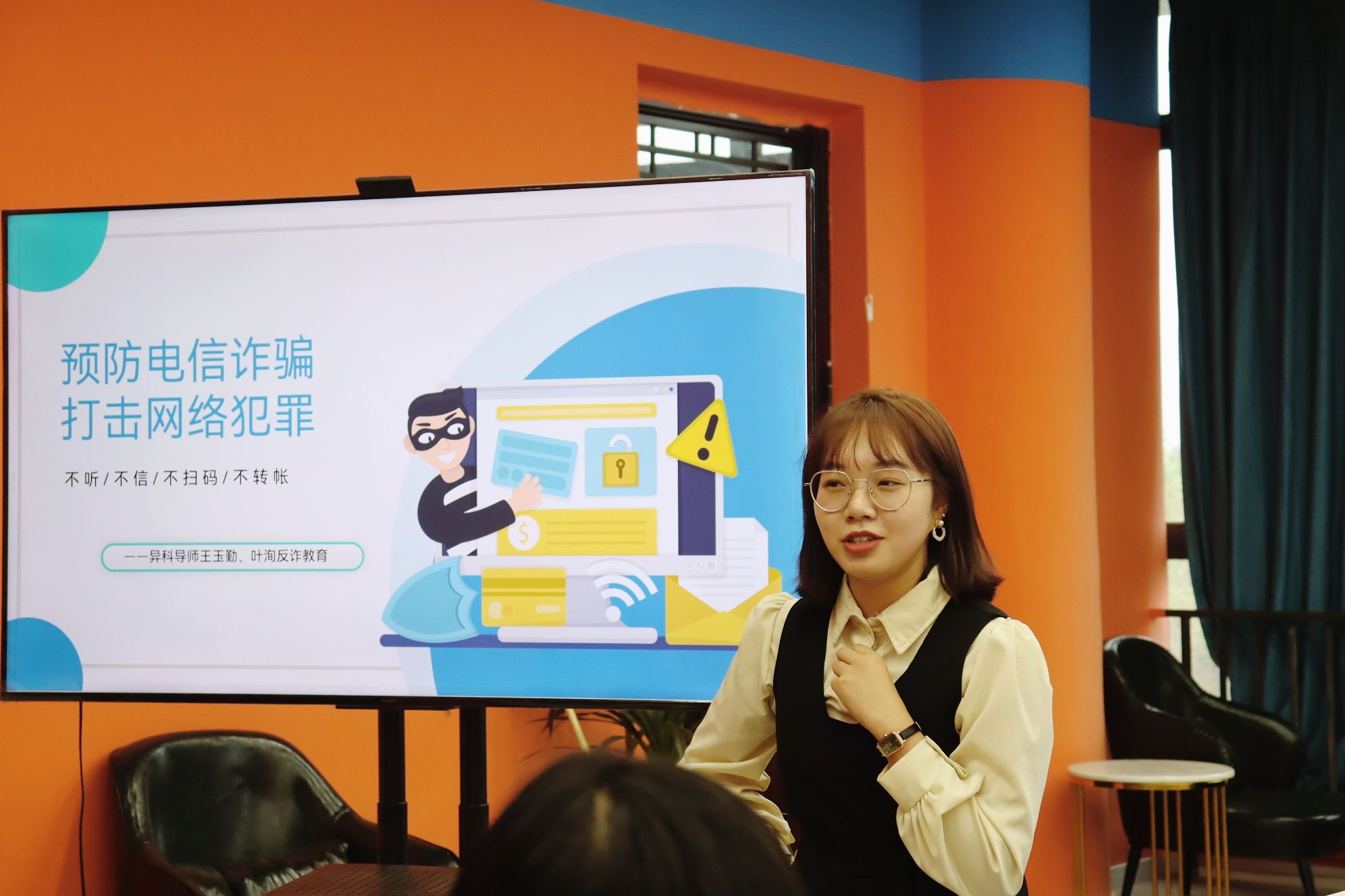 活动最后,王玉勤和叶洵两位老师,开展了“预防电信诈骗,打击网络犯罪”为主题的反诈宣传教育,从什么事电信诈骗、常见的诈骗套路以及大学生易受到的诈骗类型,预防诈骗的方法展开讲解,结合自身经验及工作案例,深入浅出地为同学们牢固树立反诈意识。并邀请到淬炼商学院学生皮佳鑫同学分享冒充熟人诈骗的常见案例,告诉同学们防骗有多重要。